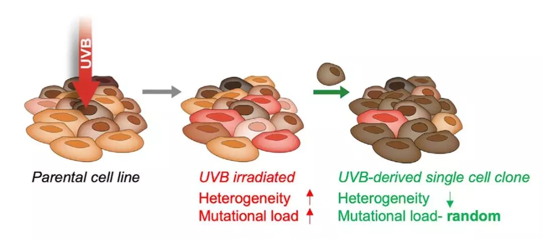 研究人員用適度的紫外線(UVB)照射一個黑色素瘤細胞系,照完之后做全外顯子測序。結果和預料的一樣,照射后的黑色素瘤細胞的TMB升高了,異質性也升高了。不過,經過紫外線照射的細胞在培養皿里的生長速度卻變慢了。