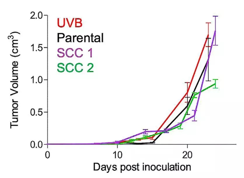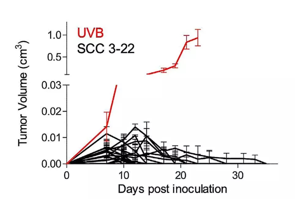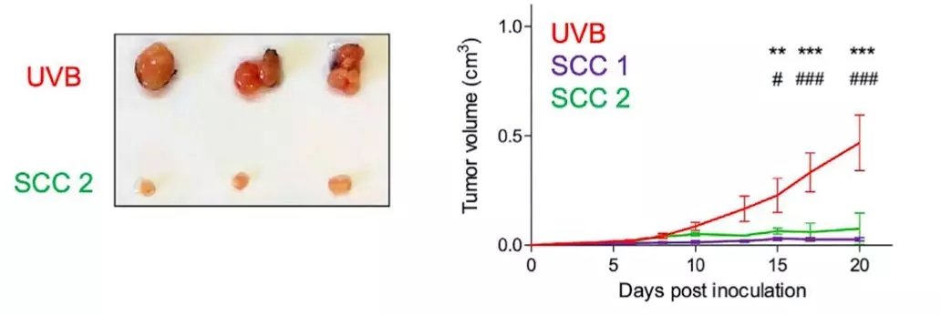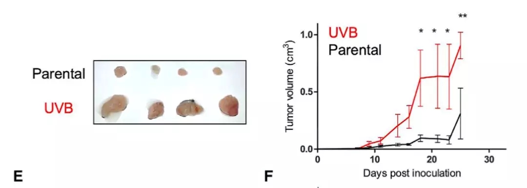 然后他們將未經紫外線照射,和紫外線照射處理的癌細胞,分別移植到不同的小鼠體內。結果發現經過紫外線照射的癌細胞,在小鼠體內形成的腫瘤,生長速度卻是明顯變快了。這暗示,紫外線照射后的癌細胞,對免疫系統的抑制似乎變得更強了。