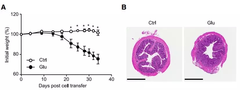 研究者首先嘗試高葡萄糖攝入是否會影響小鼠的自身免疫。他們選了一種常用的結腸炎模式小鼠,這種小鼠不能產生正常的成熟免疫細胞,通過給它移植T細胞可以激活腸道炎癥。當研究者在T細胞移植前兩天給小鼠喂20%的糖水,它們移植后的病情明顯更加嚴重,體重減輕得更多,腸道組織的情況也更不妙。就算只喂10%的糖水,病情也會加重。