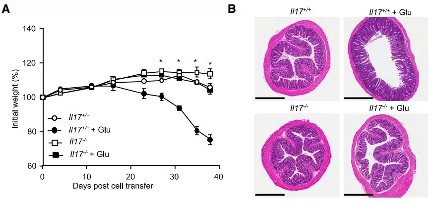 實驗結果也不出所料。如果只給小鼠吃糖不轉移T細胞,那么小鼠根本就不會發?。蝗绻o小鼠轉移一些有基因缺陷、不能產生白介素17的T細胞,那么吃糖也不會讓它的病情變得更嚴重。