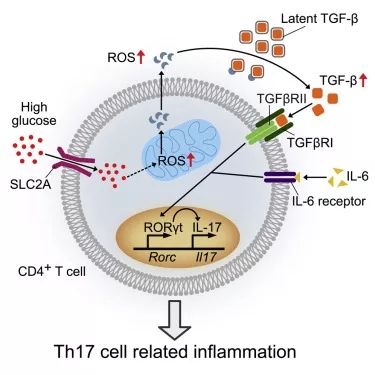 研究者們發現,“超標”的葡萄糖就像給細胞上滿了汽油,誘使線粒體以大功率運轉,產生的活性氧(ROS)激活了轉錄生長因子β(TGF-β),從而促進輔助T細胞17(Th17)生成,導致免疫系統進一步失衡,加劇自身免疫性疾病。