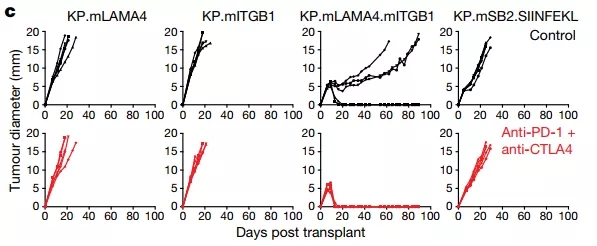把新抗原表達(dá)不同的肉瘤細(xì)胞,注射到小鼠體內(nèi)時,單獨(dú)表達(dá)mITGB1或者mLAMA4的癌細(xì)胞,并不能誘導(dǎo)抗癌免疫應(yīng)答,腫瘤該怎么長怎么長;但兩種新抗原同時表達(dá)時,腫瘤的生長速度卻變慢了,明顯是受到了免疫應(yīng)答的殺傷!