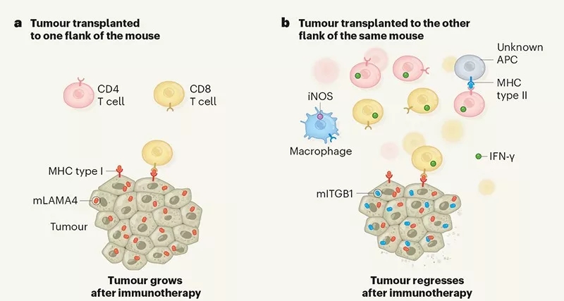 使用PD-1抑制劑+CTLA-4單抗聯(lián)合治療時,腫瘤更是完全消失了。如果把mITGB1和mLAMA4,換成兩種只能被效應(yīng)T細(xì)胞識別的MHCI類新抗原,免疫治療的療效就基本消失了。這說明激活免疫重要的是抗原類型,而不是抗原量。