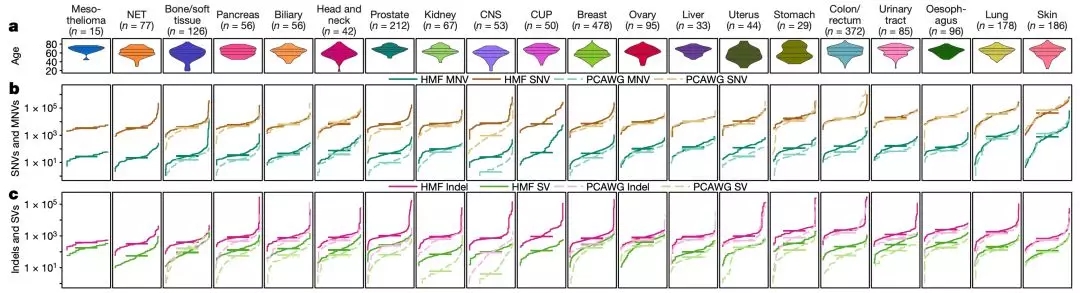 共鑒定出7000多萬個(gè)體細(xì)胞變異,包括近6000萬個(gè)單核苷酸變異(SNV),84萬個(gè)多核苷酸變異(MNV),960萬個(gè)DNA片段插入和缺失(indels),以及65萬多個(gè)結(jié)構(gòu)變體(SV),并且獲得了每個(gè)轉(zhuǎn)移腫瘤樣本的遺傳突變名錄。