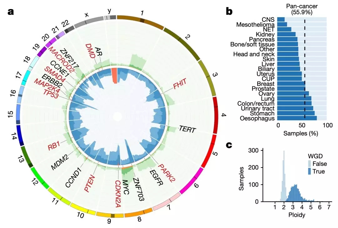 還有一個(gè)比較常見現(xiàn)象的是全基因組加倍(WGD),56%的腫瘤樣本出現(xiàn)了這種現(xiàn)象,從中樞神經(jīng)腫瘤的15%到食管癌的80%。而且這種情況,遠(yuǎn)遠(yuǎn)高于之前報(bào)道的原發(fā)腫瘤的25%-37%[17-19]。