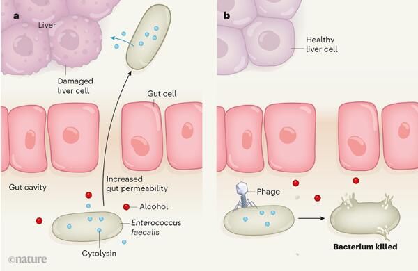 為了檢測(cè)是否能夠開(kāi)發(fā)出一種方法來(lái)特異性地從小鼠機(jī)體中移除產(chǎn)生細(xì)胞溶素的糞腸球菌,研究者識(shí)別出了一種能靶向作用糞腸球菌但并不會(huì)影響其它腸道菌群的噬菌體,他們發(fā)現(xiàn),相比移植了能夠殺滅在動(dòng)物機(jī)體中并不經(jīng)常存在的細(xì)菌的小鼠而言,接受了人類糞便移植、高酒精含量飲食且給予了靶向作用糞腸球菌噬菌體的小鼠的肝臟損傷程度較低。