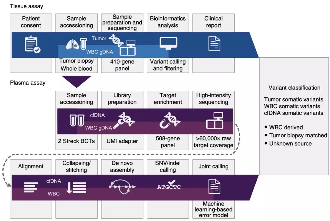 研究人員從癌癥患者身上獲取了腫瘤組織樣本、cfDNA和白細胞DNA,從無癌志愿者身上獲取了cfDNA和白細胞DNA樣本。
