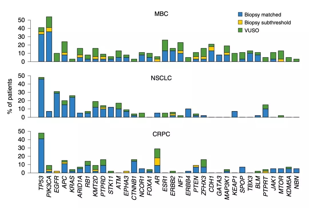 而且,在cfDNA發現的基因突變中,有一些突變雖然在腫瘤組織檢測中出現,但是頻率極低,還有一些在腫瘤組織和白細胞中均沒有出現過(研究人員把它們叫做VUSOs)。