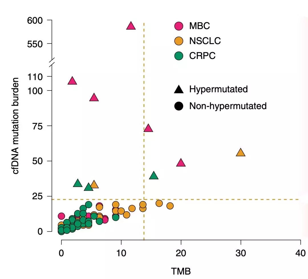 分析發現,腫瘤組織活檢發現了6個高TMB的樣本,其中4例樣本也被cfDNA判定為有高TMB。不過,cfDNA還判定另外6個樣本為高TMB樣本,但是腫瘤組織檢測結果不支持cfDNA的結果。