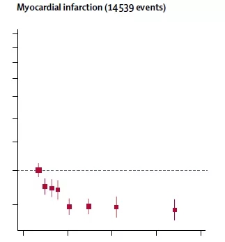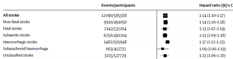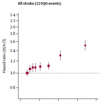 如圖所示,所有的計數點都在虛線之上,虛線1.0代表的是每周攝入酒精量在0-25g的情況下的本底值。也就是說,喝酒就提高卒中風險。