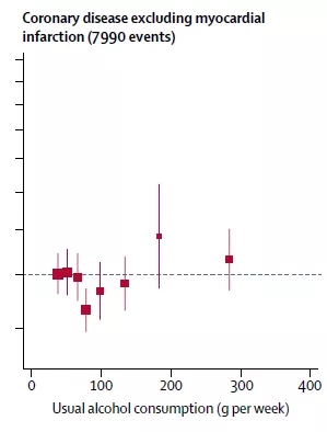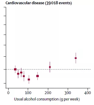在綜合各項心血管疾病的數據之后,總的來說心血管疾病和酒精的關系如下圖——