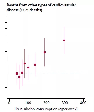 除了上述幾種心血管疾病,其他心血管疾病與酒精的關系如上圖,基本上也是多喝多死。