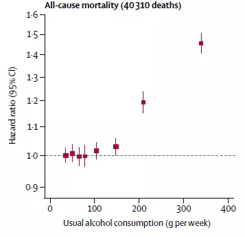 圖中,每周攝入酒精超過350g,全因死亡風險直接一飛沖天……
