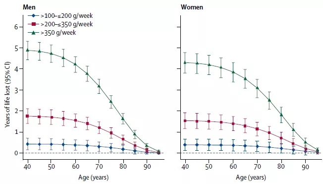 綠色線是每周攝入酒精量大于350g的作死組的預期減壽情況,越年輕的飲酒者越受影響,40歲的飲酒者每周攝入量超350g,預期壽命減少接近5年。