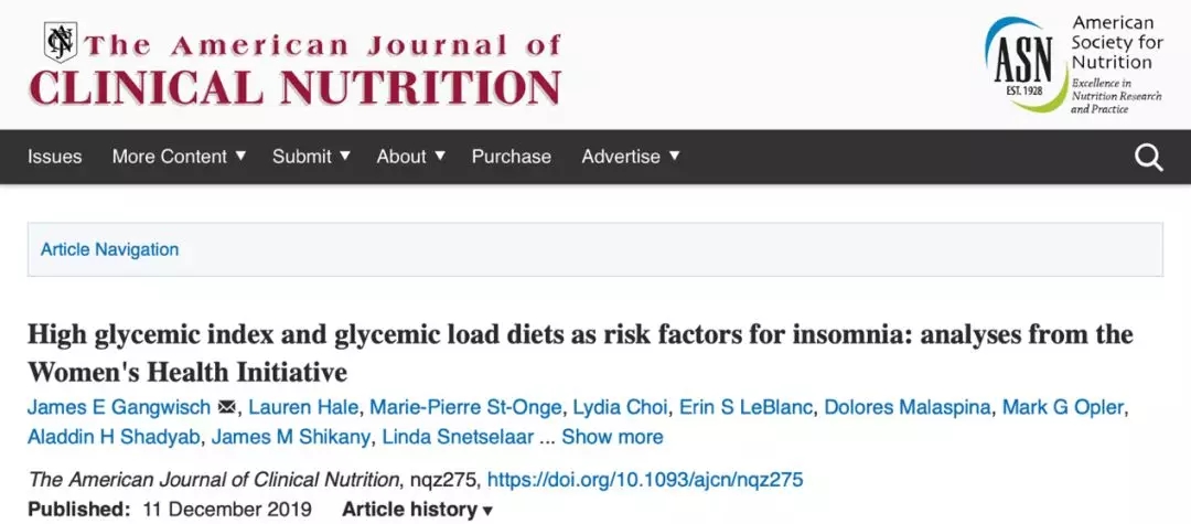 James E Gangwisch, et al. High glycemicindex and glycemic load diets as risk factors for insomnia: analyses from theWomen's Health Initiative. The America Journal of Clinical Nutrition. 11 Dec,2019.