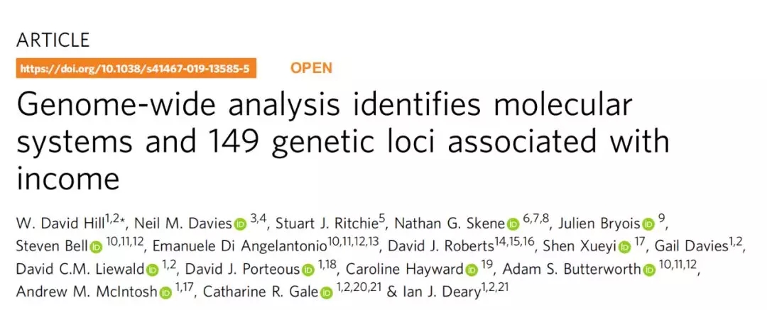 2019年12月16日,愛丁堡大學的W. David Hill團隊在國際頂尖學術期刊 Nature 雜志子刊 Nature Communications 雜志上發表了題為:Genome-wideanalysis identifies molecular systems and 149 genetic loci associated withincome(全基因組分析確定了與收入相關的分子系統和149個遺傳位點)的研究論文。
