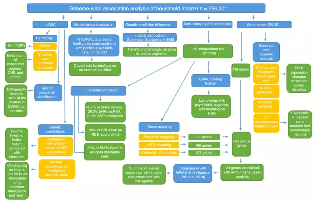 在本論文中,研究者使用英國生物銀行的數據集來檢查當代英國樣本中家庭收入的基因關聯性(n= 286,301)。研究人員確定了30個獨立的全基因組顯著位點,其中29個在以前的工作中未見報道。研究者使用一種利用遺傳相關性狀的遺傳力的方法,對GWAS(MTAG)進行多性狀分析,發現另外120個基因座與收入相關。