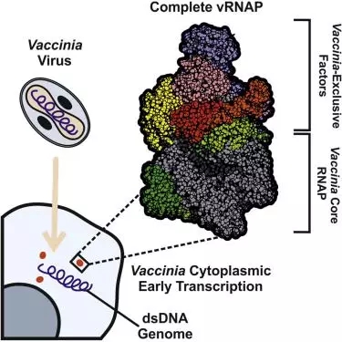 在兩項新的研究中,來自德國維爾茨堡大學生物中心和馬克斯普朗克生物物理化學研究所的研究人員如今首次成功過地在原子分辨率下解析出牛痘病毒RNA聚合酶(Vaccinia RNA polymerase, vRNAP)的三維結構。牛痘病毒屬于痘病毒家族,對人類無害,并構成所有天花疫苗的基礎。由于它的良好特性,它當前用于溶瘤病毒療法的測試中,其中溶瘤病毒療法是一種抵抗癌癥的新策略。相關研究結果近期發表在Cell期刊上,論文標題分別為“Structural Basis of PoxvirusTranscription: Vaccinia RNA Polymerase Complexes”和“StructuralBasis of Poxvirus Transcription: Transcribing and Capping Vaccinia Complexes”。這兩篇論文的通訊作者為維爾茨堡大學的Utz Fischer博士和馬克斯普朗克生物物理化學研究所的Patrick Cramer博士。
