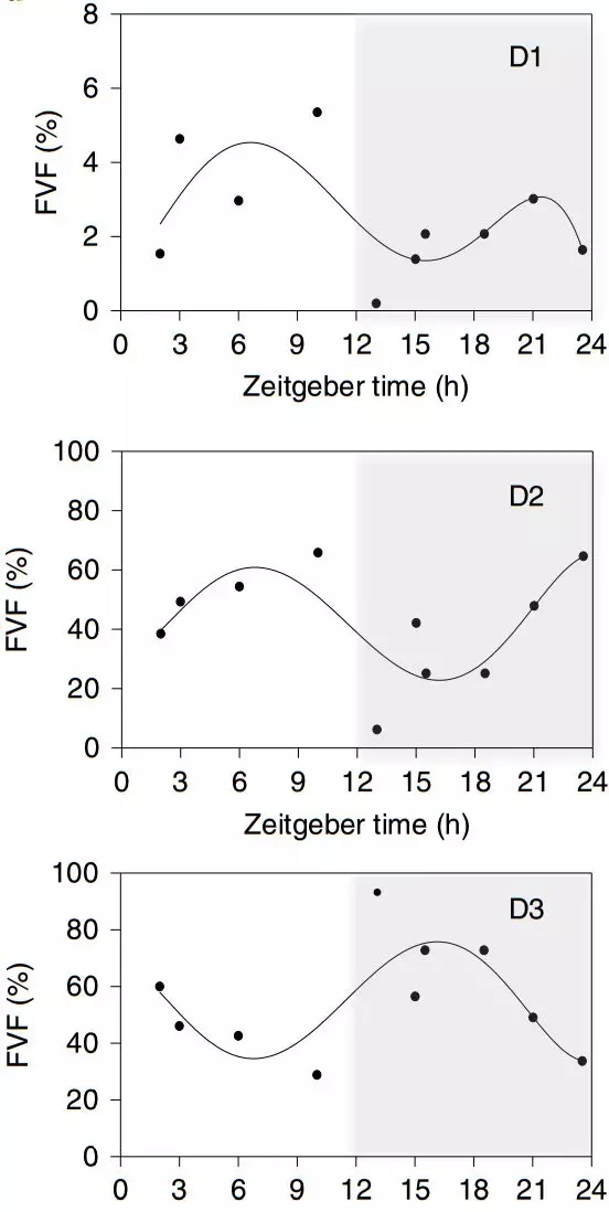 直徑在75nm以下的D1類膠原纖維和75~150nm的D2類膠原纖維數量,大約在每天開始光照后7小時左右達到高峰,進入黑暗后4小時左右到達低谷。而直徑大于150nm的D3類纖維與之相反,大約在每天開始光照后7小時左右達到低谷,進入黑暗后4小時左右到達高峰。