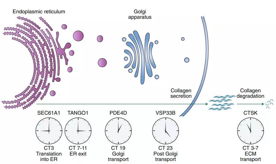 基因層面上,研究人員發現,在一個晝夜周期中,SEC61、TANGO1、PDE4D和VPS33B這四種蛋白會依次表達。