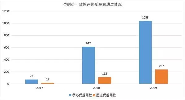 2019年,仿制藥一致性評價承辦的受理號達到1038個,同比增加69.61%。通過的受理號數為237個,同比增加111.61%。
