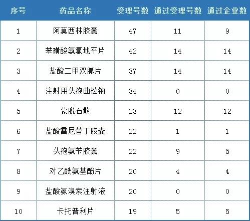 1772個一致性評價承辦的受理號中:阿莫西林膠囊最多,受理號數量為47個;其次為苯磺酸氨氯地平片,受理數量為42個。通過方面,苯磺酸氨氯地平片和鹽酸二甲雙胍片最多,受理號數為14;蒙脫石散和頭孢呋辛酯片并列第二,受理號數為12個;阿莫西林膠囊、瑞舒伐他汀鈣片并列第三,受理號數為11個。(這里的通過不包括視同通過)