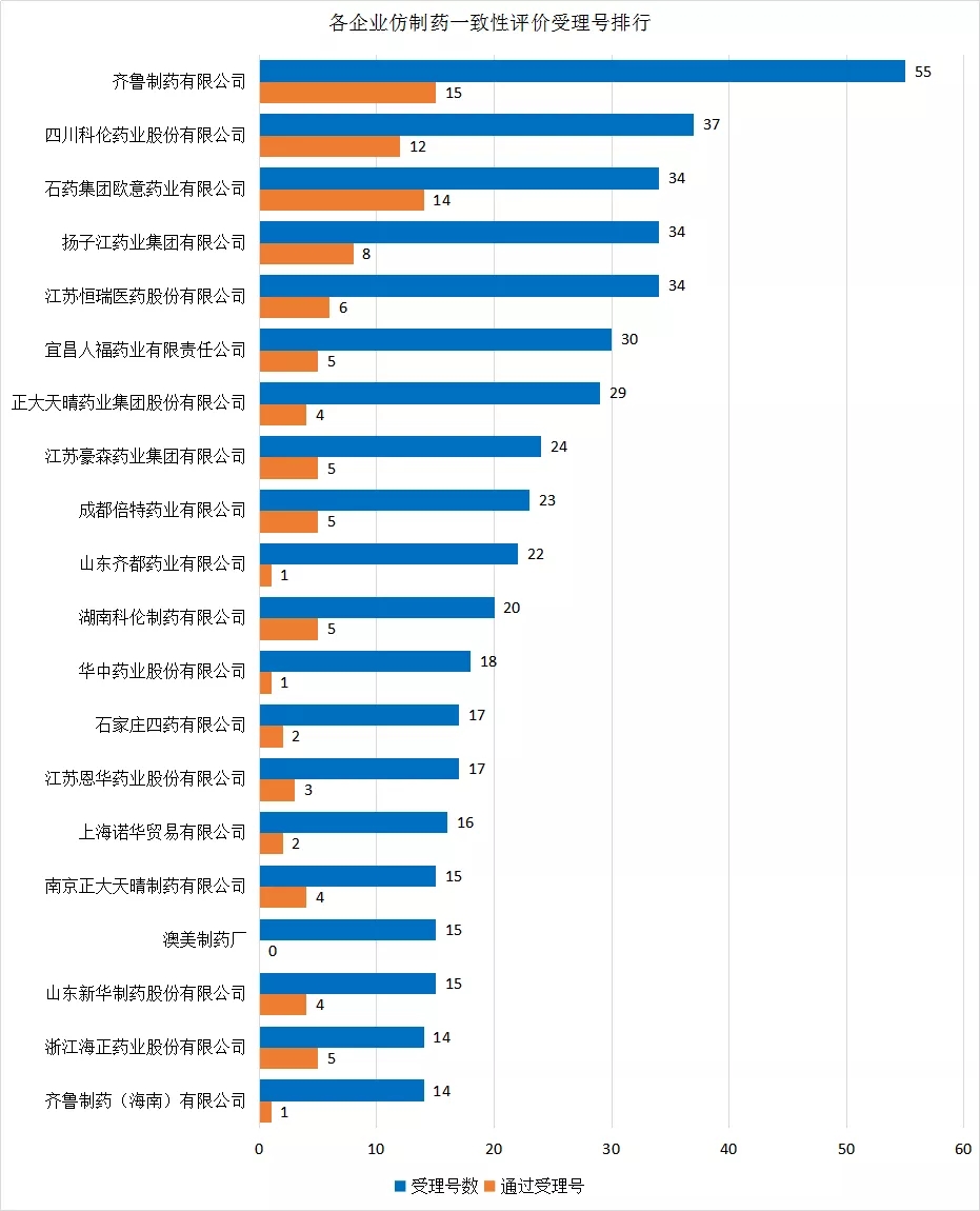目前,共有473家企業一致性評價品種進入受理,其中受理號超過30個的企業有6家,分別是齊魯制藥、科倫藥業、石藥集團歐意藥業、揚子江藥業、恒瑞醫藥、人福藥業。