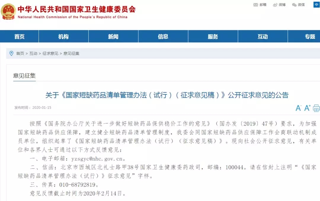1月15日,國家衛健委網站發布了《國家短缺藥品清單管理辦法(試行)(征求意見稿)》(下稱“《意見稿》”),明確國家組織制定國家短缺藥品清單和臨床必需易短缺藥品重點監測清單。