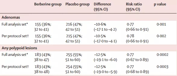 黃連素組和安慰劑組,分別有429和462名患者完成了兩年的試驗隨訪,這些患者結直腸腺瘤的復發情況對比,就是試驗的主要終點。