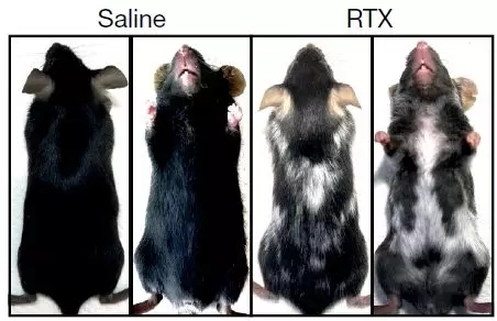 注射鹽水(saline)和樹脂毒素(RTX)小鼠毛發的對比(真·辣到褪色)