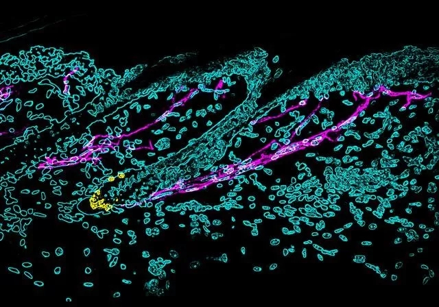 另一種染色方法下的黑素干細胞(黃)和交感神經(紫)