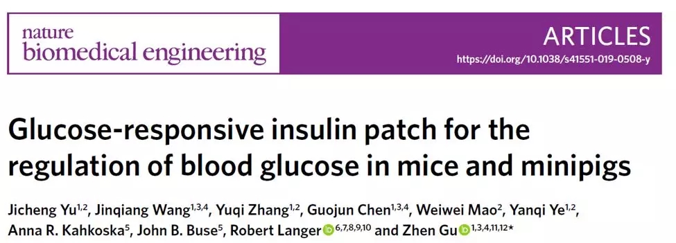 2020年2月3日,加州大學(xué)洛杉磯分校(UCLA)顧臻教授課題組及生物醫(yī)藥公司-Zenomics在 Nature Biomedical Engineering 雜志上發(fā)表了文章題為:Glucose-responsive insulin patch for the regulationof blood glucosein mice and minipigs 的研究論文。