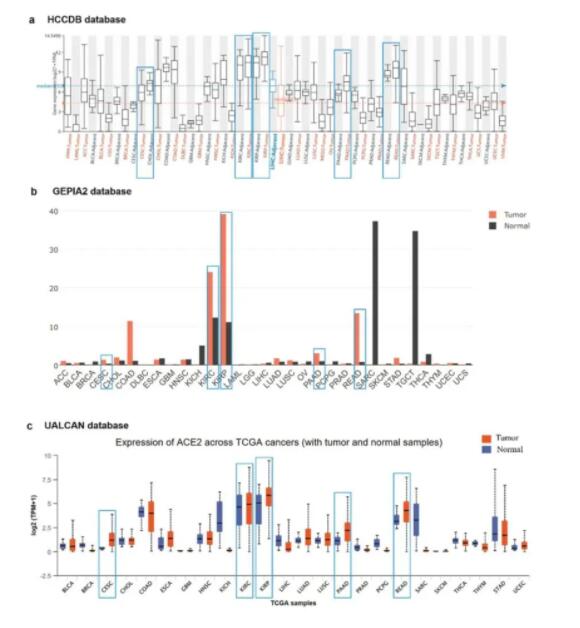 研究者發(fā)現(xiàn)五種癌癥,包括宮頸鱗狀細胞癌和宮頸內(nèi)膜腺癌、胰腺腺癌、腺癌、腎乳頭狀細胞癌、腎透明細胞癌等腫瘤組織中 ACE2表達較周圍組織更高,前三種尤甚。其中胰腺癌組織ACE2表達量顯著高于肺部,宮頸癌組織ACE2表達量與肺部相近,因此這幾種癌癥患者被SARS-CoV-2感染的可能性增加。