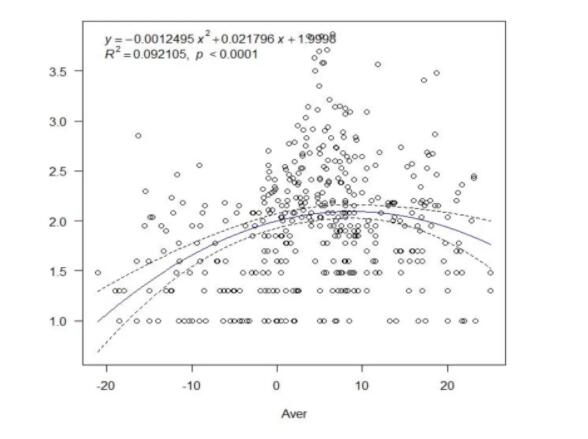 研究者發現日確診人數的對數值(lgN)隨溫度的升高,先上升后下降;峰值lgN對應的平均溫度為8.72℃,最低溫度6.70℃,最高溫度12.42℃。在溫度較低的環境中,平均溫度每上升1℃,日確診人數增加0.83人;在單因素模型中,溫度較低的環境中,平均溫度每上升1℃,日確診減少降低0.86人。