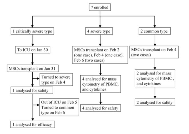 在2020年1月23日至2月16日期間,研究者共征集了首都醫科大學附屬北京安佑醫院的7名COVID-19患者,其中包括1名危重癥患者、4名重癥患者和2名輕癥患者,探究間充質干細胞移植后14天內,患者的免疫系統和炎癥系統功能變化,以及副作用的發生情況。