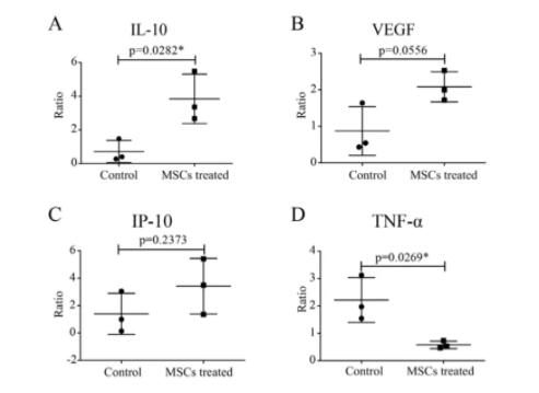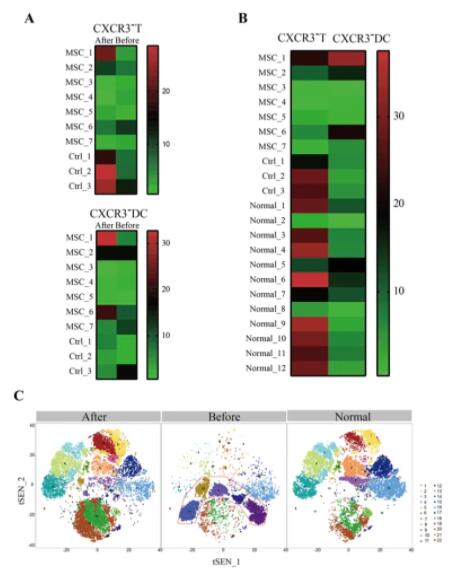 研究者通過質譜流式分析發現間充質干細胞移植后,導致細胞因子風暴的元兇——過度活化的免疫細胞CXCR3 + CD4 + T細胞、CXCR3 + CD8 + T細胞和CXCR3 + NK細胞在3-6天內消失。另外,CD14 + CD11c + CD11bmid調控的樹突狀細胞數量急劇增加。另外,與安慰劑對照組相比,MSC治療組的TNF-α水平顯著降低而IL-10水平升高。以上結果在重癥患者中尤其顯著。