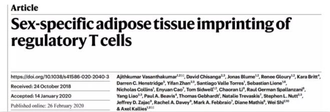 近日,澳大利亞墨爾本大學的研究人員在國際頂尖學術期刊 Nature 雜志上發表了一篇題為:Sex-specific adipose tissue imprinting of regulatory T cells 的研究論文。