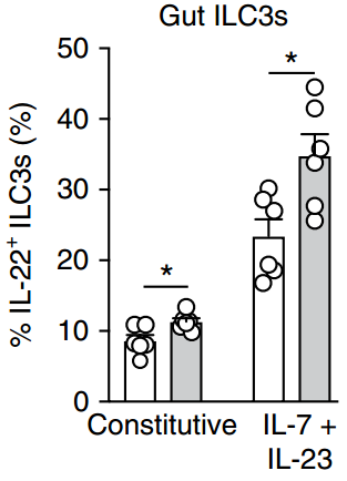 禁食后(白色)小鼠腸道ILC3s中IL-22陽性的比例明顯低于自由攝食(灰色)的小鼠