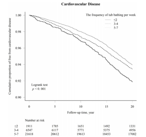 在排除了潛在影響因素后,對數(shù)據(jù)的分析表明,與每周一至兩次泡澡或根本不泡澡相比,每天洗熱水澡可以降低28%的心血管疾病總風(fēng)險,降低26%的中風(fēng)總風(fēng)險,而浴缸浴的頻率與心源性猝死的風(fēng)險增加無關(guān)。