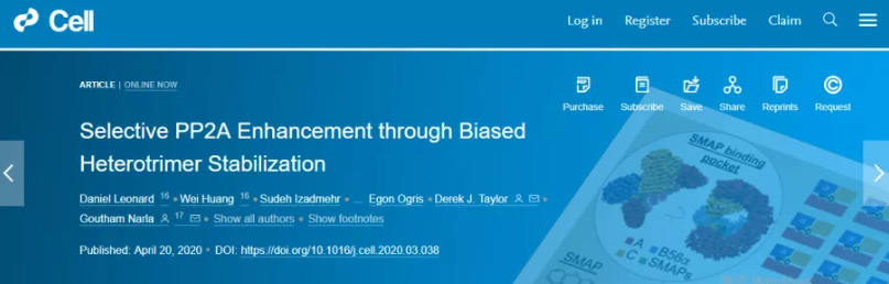 [2] Selective PP2A Enhancement ThroughBiased Heterotrimer Stabilization, Cell (2020).