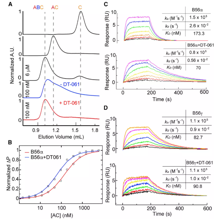 小分子DT-061屬于典型的SMAP,研究者利用細(xì)胞分離熒光素酶系統(tǒng)、免疫共沉淀(coIP)實(shí)驗(yàn)等,發(fā)現(xiàn)DT-061在細(xì)胞培養(yǎng)和體內(nèi)都可以選擇性地增強(qiáng)含有PP2A全酶種群的B56α。單獨(dú)表達(dá)和純化PP2A各亞基,發(fā)現(xiàn)DT-061可以直接穩(wěn)定AB56αC異種三聚體。