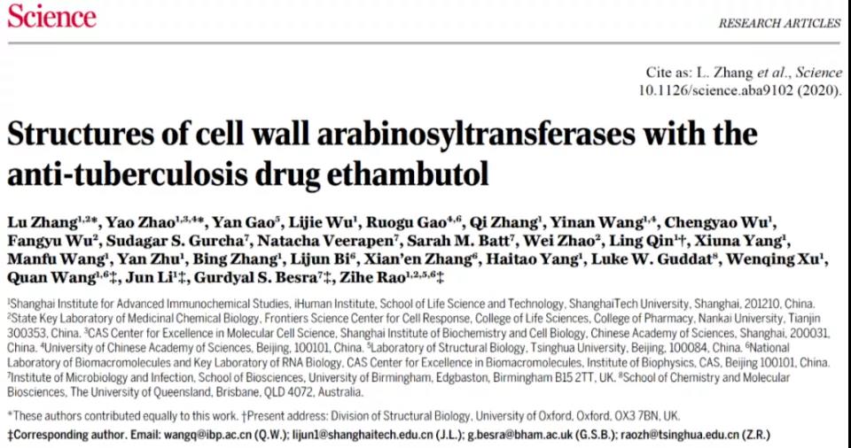 2020 年 4 月 24 日,上海科技大學(xué)免疫化學(xué)研究所饒子和院士團(tuán)隊(duì)與合作者在 Science 上發(fā)表了題為:Structures of cell wall arabinosyltransferases with the anti-tuberculosis drug ethambutol 的研究論文。