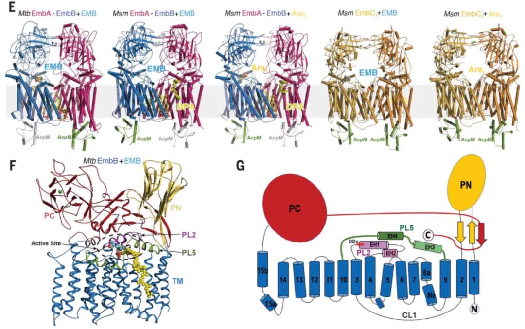 從整體結(jié)構(gòu)來(lái)看,EmbA 和 EmbB 以異源二體形式,而 EmbC 以同源二體形式發(fā)揮生理功能(如圖 E 所示)。參與細(xì)胞壁分枝菌酸(MA)合成的酰基載體蛋白(AcpM)結(jié)合于每個(gè) Emb 蛋白的胞內(nèi)側(cè),分別形成兩種復(fù)合體(如圖 E 所示)。EmbA,EmbB 和 EmbC 蛋白結(jié)構(gòu)有著相似的折疊和共同結(jié)構(gòu)特征,比如都有 15 次跨膜結(jié)構(gòu)域,以及 N 端和 C 端的 periplasmic domains (PDs),被稱(chēng)為 PN 和 PC。周質(zhì)環(huán) 2 (PL2)包含兩個(gè)交叉螺旋(EH1 和 EH2),并含有高度保守的與催化相關(guān)的 DDX 序列,此活性中心位于胞外結(jié)構(gòu)域和跨膜結(jié)構(gòu)域之間(如圖 F 和 G 所示)。