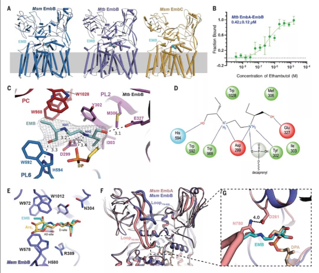 具體結(jié)構(gòu)研究表明,EMB 與 EmbB 和 EmbC 的結(jié)合位點(diǎn)(如圖 C 和 D 所示),為了進(jìn)一步確定 EMB 的作用機(jī)理,研究者通過(guò)結(jié)構(gòu)比對(duì),得到了 EMB 與阿拉伯糖供體(DPA)和二糖(Ara2)的結(jié)構(gòu)疊合模式(如圖 E 和 F 所示)。通過(guò)結(jié)構(gòu)對(duì)比我們發(fā)現(xiàn),EMB 占據(jù)了催化氨基酸 Asp 兩側(cè)的二糖(Ara2)結(jié)合位置(D-site 和 A0-site)(圖 E),且占據(jù)了阿拉伯糖供體(DPA)結(jié)合位點(diǎn)(D-site)。