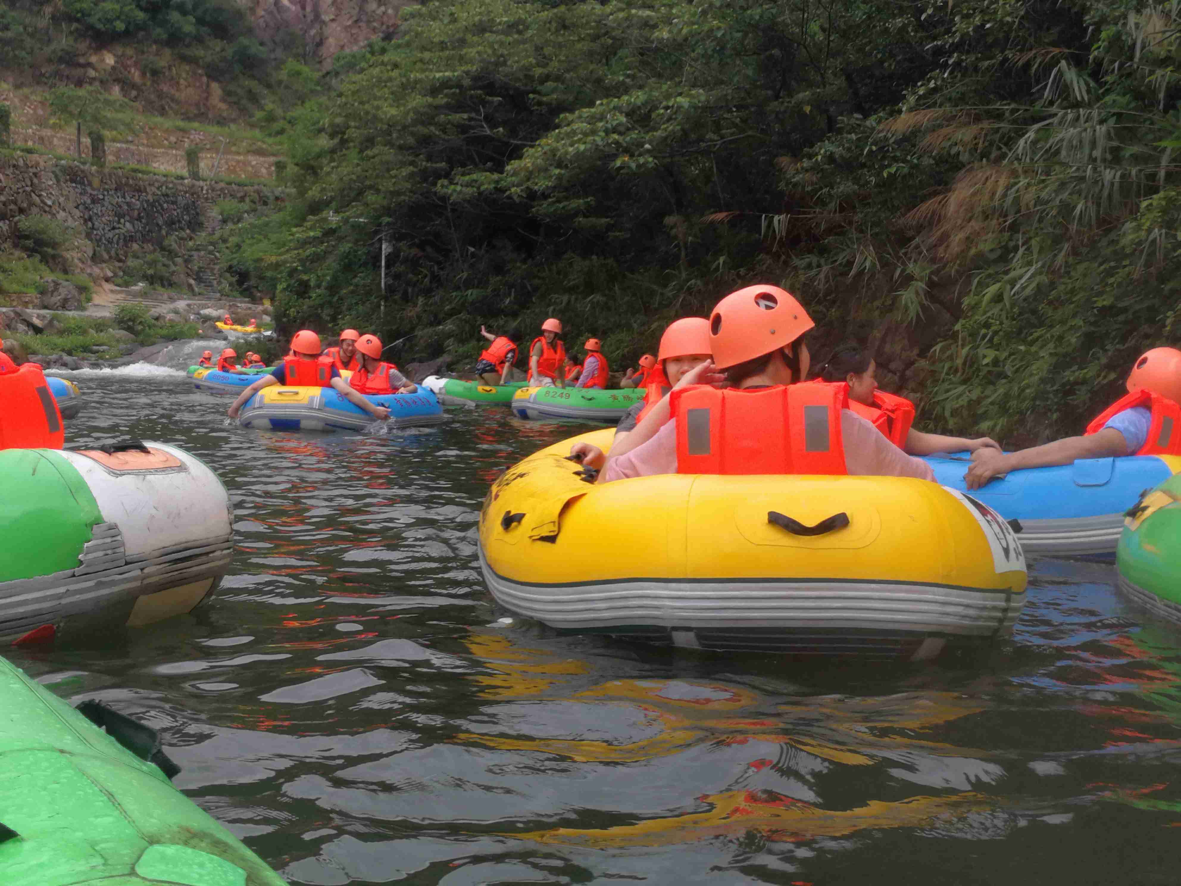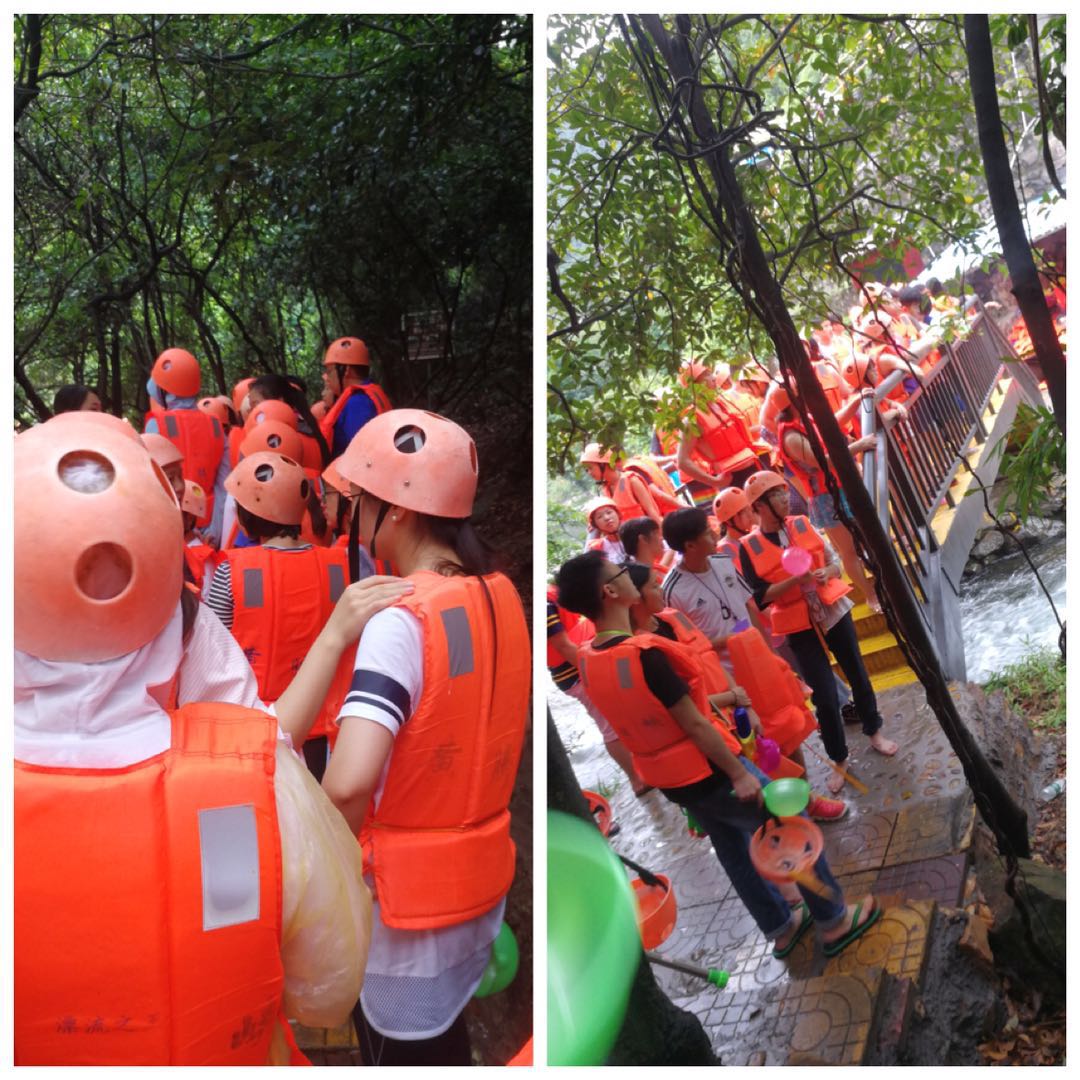 經過1個半小時的車程,我們終于到達清遠最具吸引力、最刺激、最好玩的漂流勝地黃騰峽。我們即將挑戰的是黃騰峽的勇士漂。“勇士漂”全長2.5公里,總落差168米,最高落差高達12米。沿著山路往上走,峽谷越來越陡峭,小伙伴們穿好救生衣,戴好安全帽,隨時準備漂流。聽著湍急水流聲,大家內心也越發興奮,期待著緊張又刺激的漂流體驗。