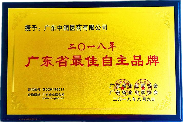 2018年8月9日,由廣東企業(yè)聯(lián)合會、廣東省企業(yè)協(xié)會聯(lián)合主辦的主題為“引領(lǐng)高質(zhì)量發(fā)展,大企業(yè)的時代擔(dān)當(dāng)”的2018年廣東企業(yè)500強、優(yōu)秀自主品牌”發(fā)布大會在廣州白云國際會議中心隆重舉行。廣東中潤醫(yī)藥有限公司憑借優(yōu)異的品牌形象、品牌知名度以及品牌影響力,榮獲“2018年廣東省最佳自主品牌”稱號。陳良賢副省長到會并代表省政府向獲獎企業(yè)表示祝賀。